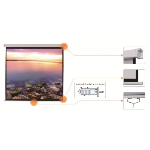 With the new technologic Manual-Auto Deviation System, in-built breaking system to allow the retraction of the screen to slow down which is control over by the semi motor gear, thus reduce the impact when the screen reaches the top case. In-return, the new Manual-Auto Deviation System can prolong the life span of the Manual projection screen. This unique Manual-Auto Deviation System will roll up the screen more smoothly identical to motorized screen.